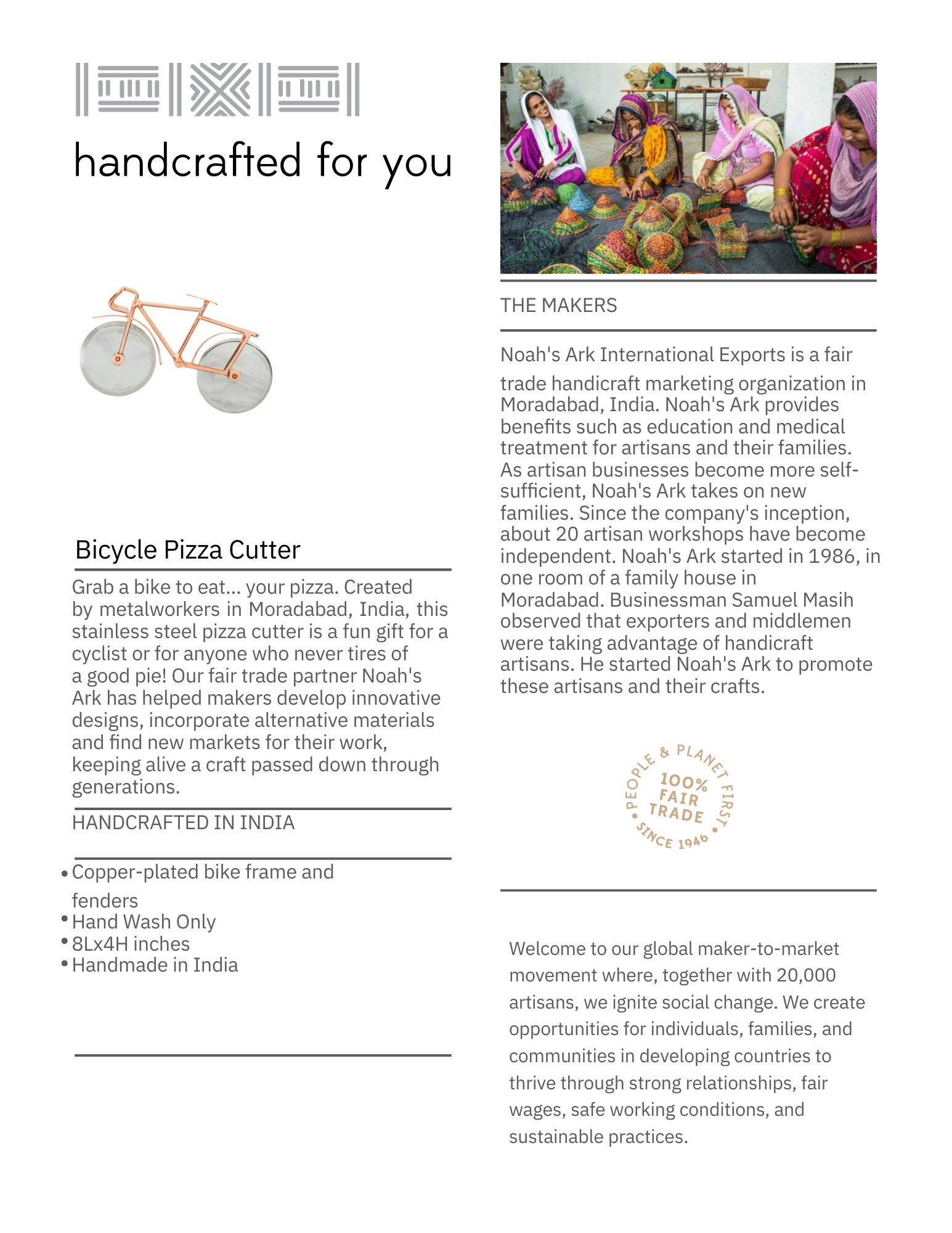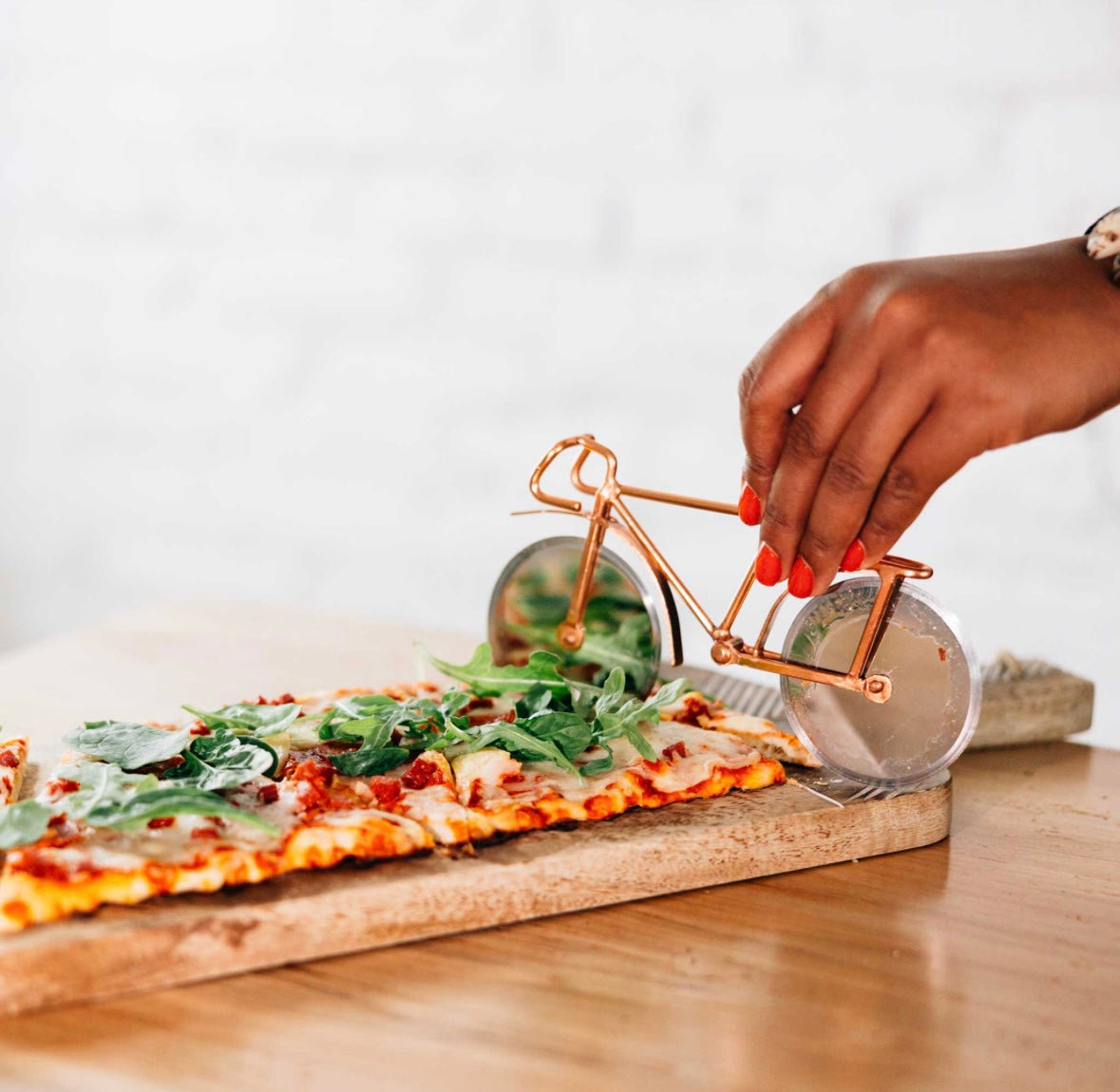 Grab a bike to eat...your pizza! Handcrafted by metalworkers in Moradabad, India, this stainless-steel pizza cutter is a fun gift for cyclists or anyone who never tires of a good pie. See what I did there?