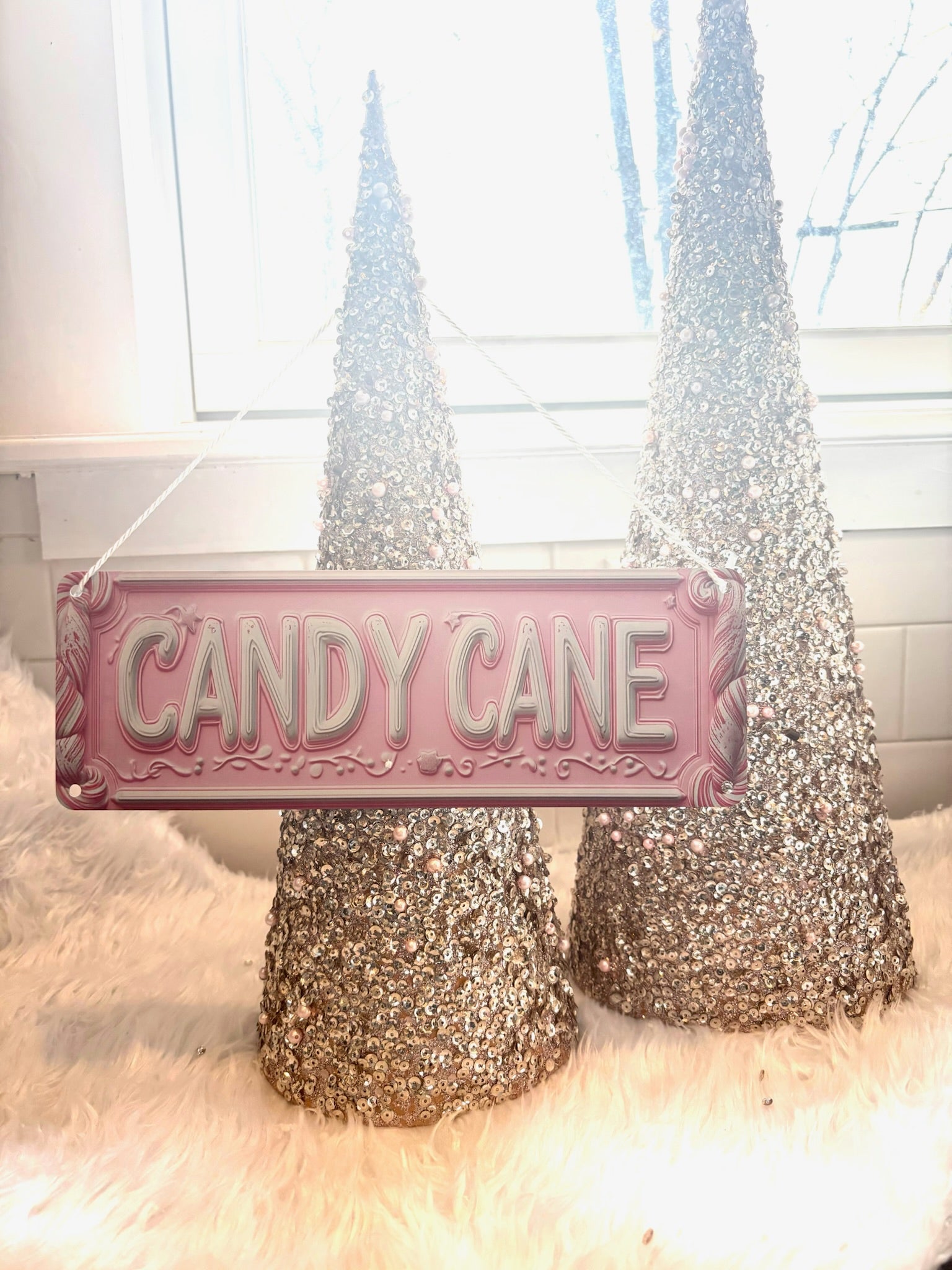 Add this adorable pink candy cane metal holiday sign to your holiday decor for a cute, whimsical touch.