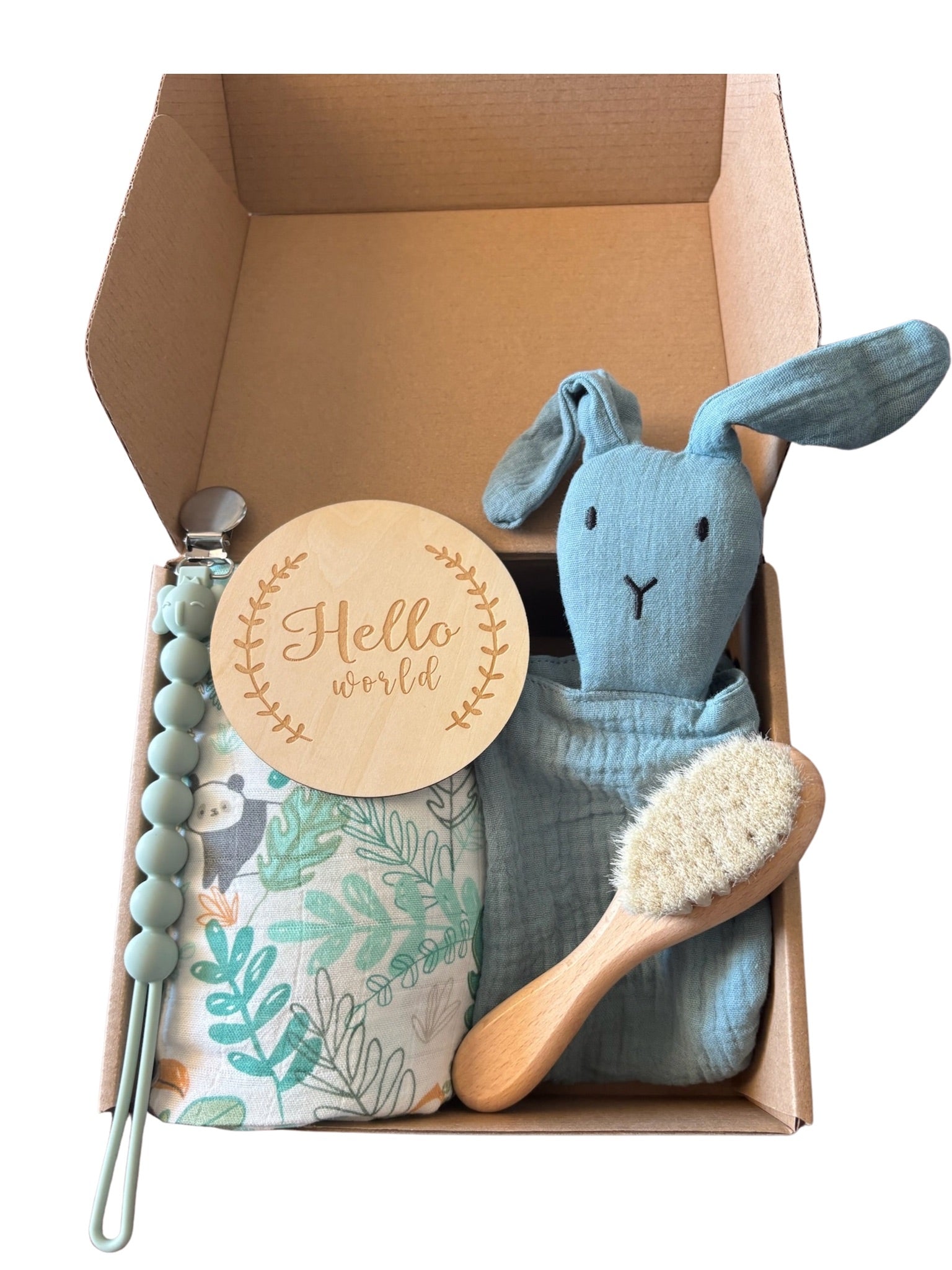 Welcome home, little one! Introducing our newborn gift box, a beautifully curated collection of essentials for the newest bundle of joy in your life. Included in this set is a silicone pacifier clip that doubles as a teether, a bamboo baby brush that offers gentle grooming for a delicate scalp, while the adorable snuggly bunny security blanket provides a sense of warmth and reassurance. For cozy moments of cuddling, our box features a supremely soft swaddling blanket made from a blend of bamboo and organic cotton. Whether you're celebrating a baby shower or welcoming your own bundle of joy, our newborn baby gift box is the perfect gift for your little one.
