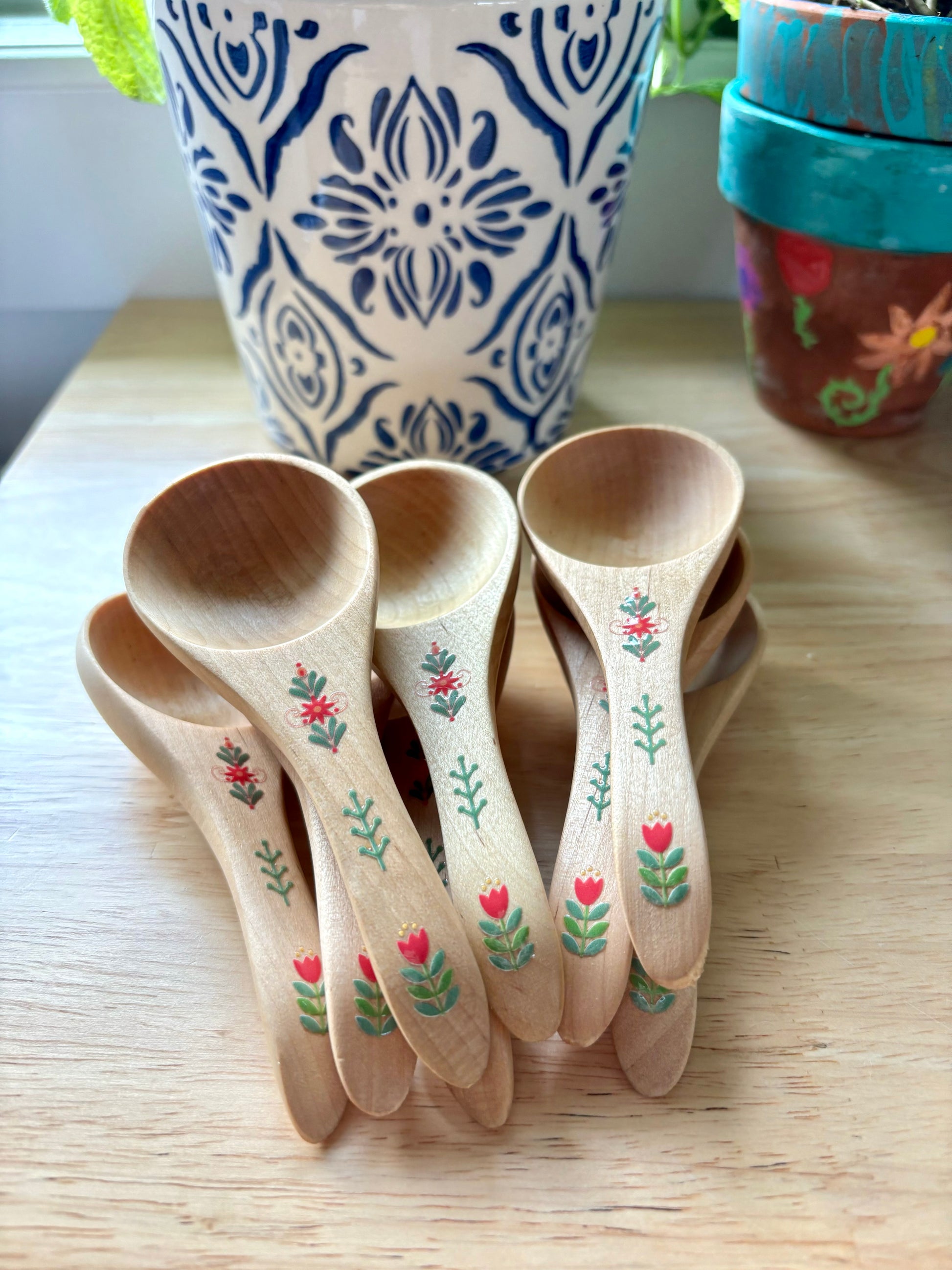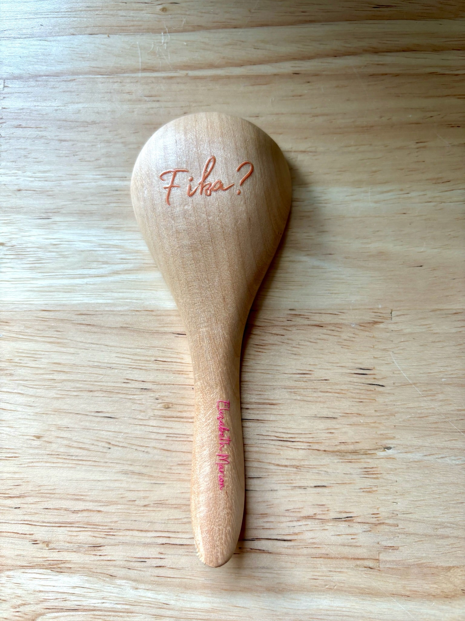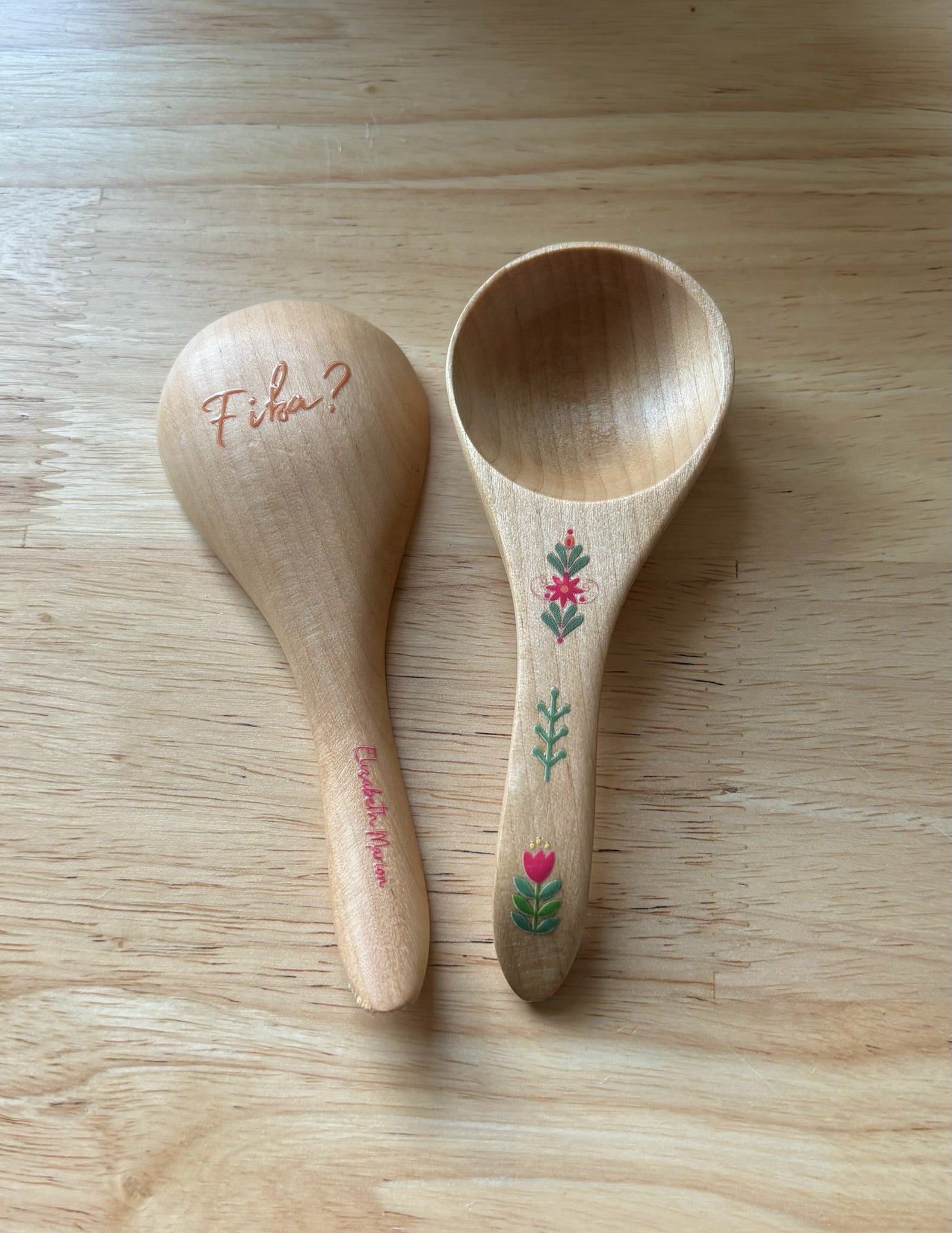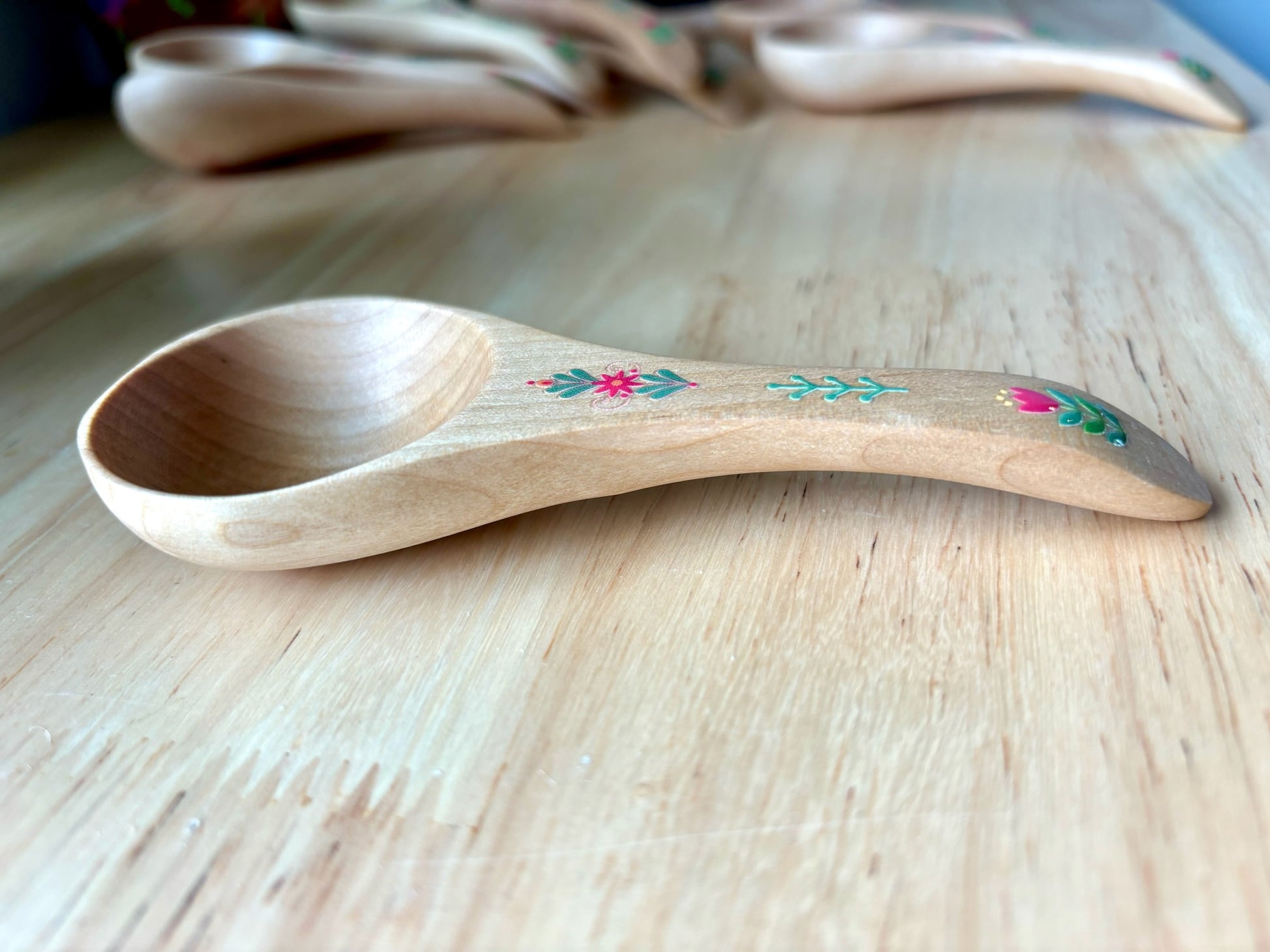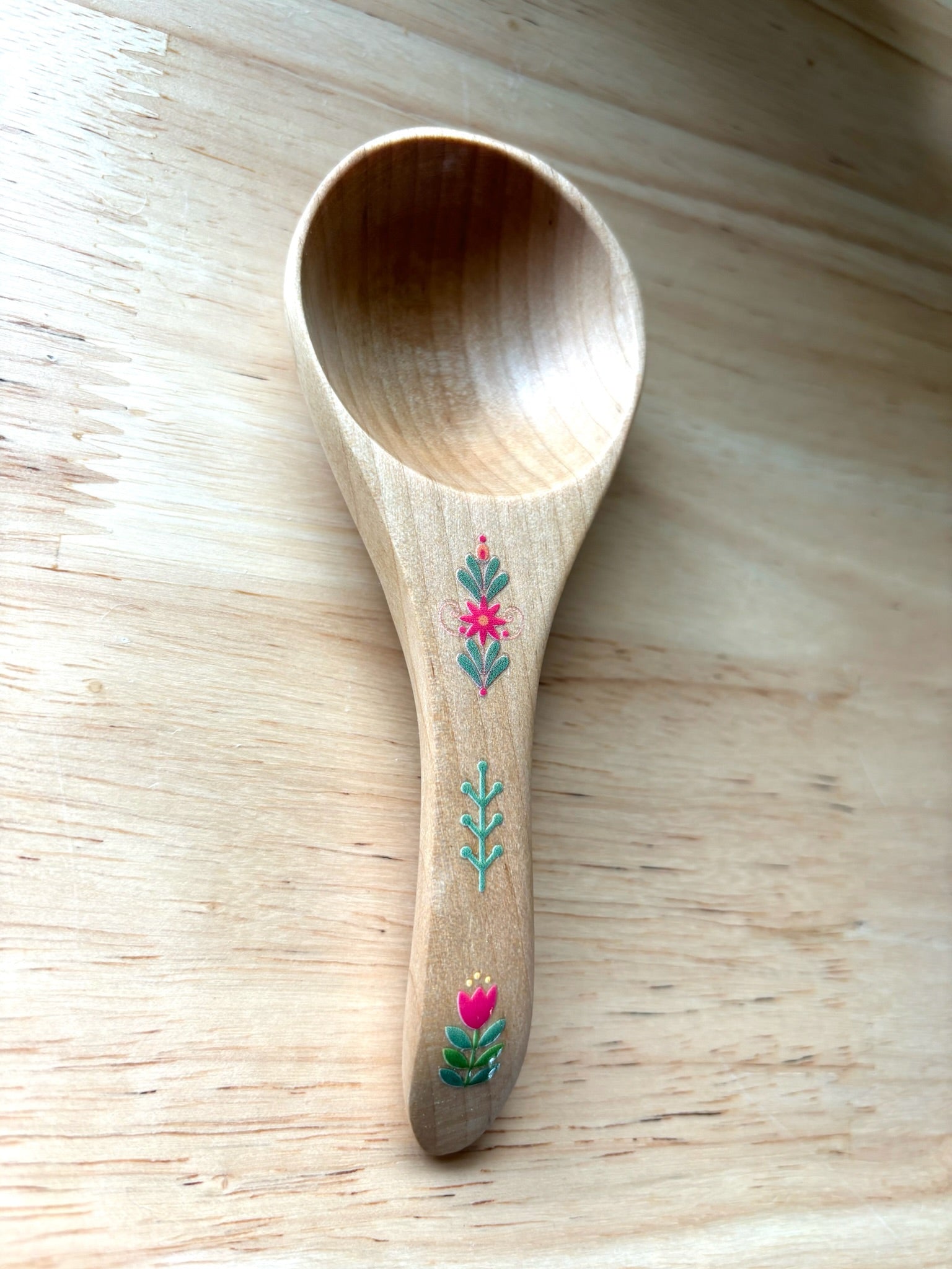 When I went to Sweden, I fell in love with the concept of “Fika” which is when you take a little time out of your day for a coffee/tea/pastry break and relax and enjoy. So I designed this spoon with this in mind while also pairing it with Nordic styled flowers.